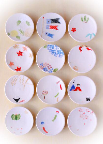 川越在住の陶芸家、石川覚子さんが 一枚一枚丁寧に絵付けをした愛らしい豆皿。 季節の風物詩や節供、神社の年中行事にまつわる日本の景色を描いていただきました。