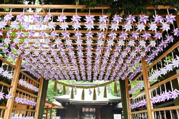 本日から、鳥居下の風鈴棚に藤色の「かざぐるま」を掛けています。