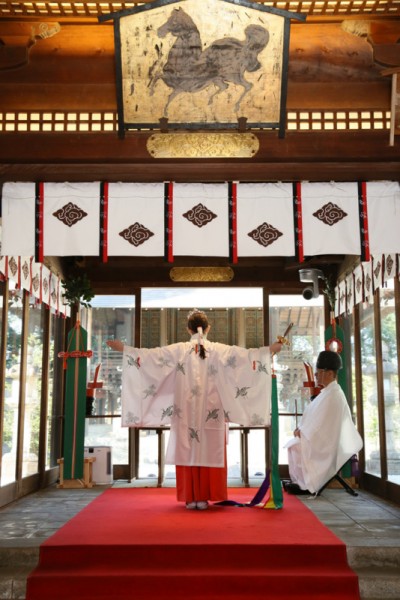 川越氷川神社では、本日14時40分より、神前に「浦安の舞」を奉奏し